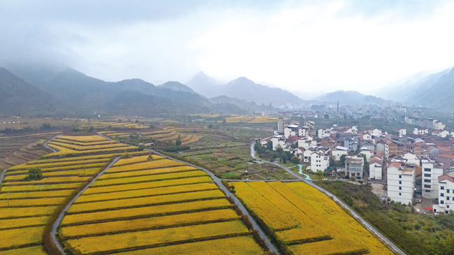 日前,俯瞰金華永康市花街鎮店園村千畝稻香公園,成熟稻田呈現金色波浪,與周邊嶄新民居、遠處云霧山林相映襯,構成一幅美麗山水畫卷。 近年來,永康市花街鎮店園村通過基本農田連片整治,打造千畝稻香公園,規?;N植水稻?!?/a>