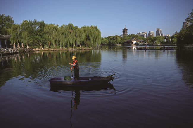 9月16日上午,嘉興市區南湖水面上波光瀲滟,幾位養護工人身著救生衣駕著小船開展水草養護,將枯草一簇簇撈起,只為守住這一汪碧水的生態底色。(徐志達)?!?/a>