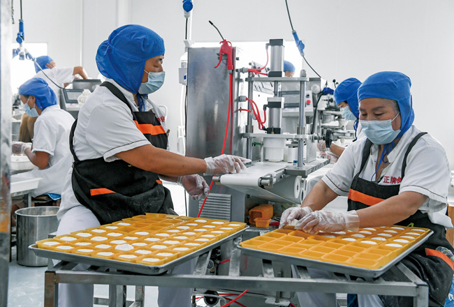 9月17日,在金華市金東區江東鎮“巾幗共富工坊”里,員工們正在趕制婺式月餅。 “巾幗共富工坊”的員工都是附近村民,隨著中秋節臨近,婺式月餅生產加工進入高峰期,每日平均產量達到17萬只?!?/a>