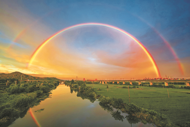 9月14日清晨,寧波余姚牟山鎮的天空中出現兩道絢麗彩虹,橫跨于古運河之上,與河畔的綠樹、草地及遠處的橋梁、房屋相映成趣,構成一幅唯美畫卷。(唐嚴、吳蒙棣)?!?/a>