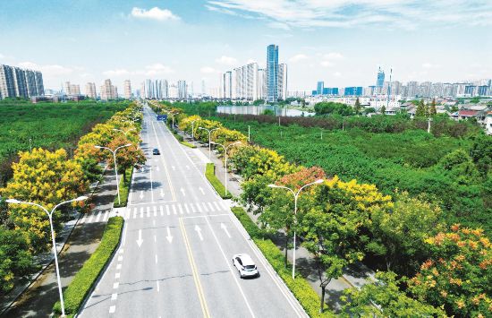 9月14日,紹興洋江西路東浦段欒樹花如期綻放,鵝黃花簇與綠葉交相輝映,為道路披上“黃金甲”,為市民出行增添了一抹亮麗秋色。(單明銘)?!?/a>