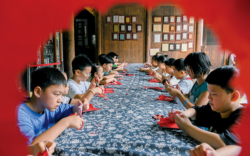 7月20日,在金華市剪紙博物館,暑期研學的小學生在體驗非遺剪紙。學生們參觀博物館里的剪紙作品,學習剪紙技巧?!?/a>