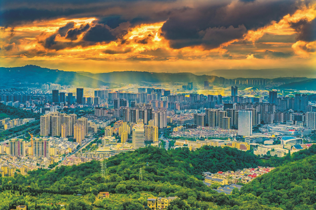 6月13日傍晚,降雨漸止,云開天晴,山城紹興新昌上空,云團與山巒、城市相互映襯,呈現出雨霽霞蔚的美景。(潘偉峰)?!?/a>