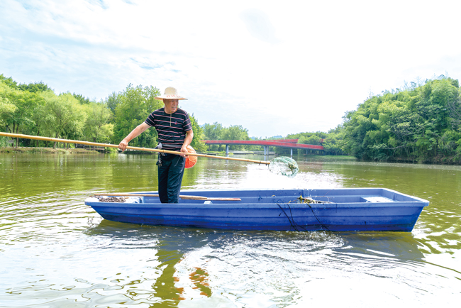 6月16日,金華浦江翠湖濕地公園保潔人員趙士援劃著小船穿梭在翠湖湖面,打撈水草、樹葉、垃圾等漂浮物。 趙士援說,入夏后氣溫升高、降雨增加,水草繁殖快,從上游飄來的垃圾增多,通過及時打撈漂浮物,守護水體環境,為來翠湖參觀的游客營造清爽環境?!?/a>