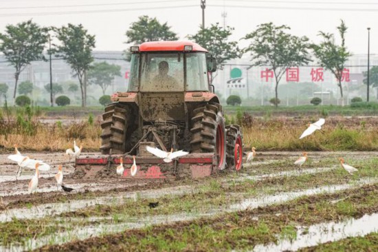 6月11日,在嘉興南湖區鳳橋鎮,農戶復耕正忙,田間翻起新泥。此刻,成群的牛背鷺、白鷺翩然而至,或優雅覓食,或展翅低飛,與勞作的農戶和諧共舞,勾勒出一幅生機勃勃的田園生態圖景?!?/a>