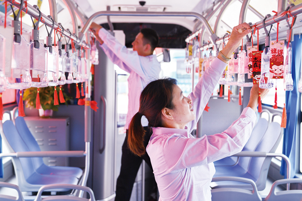 6月5日,金華公交的司乘人員在高考送考公交車廂里掛勵志卡片,放置愛心文具、急救包、礦泉水等,為接送高考學生做好準備工作。(時寬兵)?!?/a>