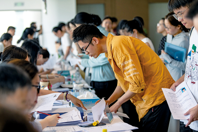 6月7日,在金華市金東區金漪云蝶中心,求職者排隊報名應聘就業崗位。 這天,2025金華市金東區大型招聘青春嘉年華在金漪湖科技創新策源地——金漪云蝶中心啟動?!?/a>
