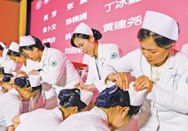 在第114個國際護士節到來之際,金華市人民醫院舉行授帽儀式。溫州醫科大學護理學院金華教學點護理專業學生身著潔白的護士服,接受前輩為其佩戴護士帽?!?/a>
