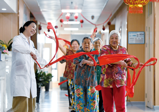 5月12日,在金華市金東區多湖街道社區衛生服務中心醫養中心,護士和住院的老人們一起扭秧歌、跳健身操、做益智游戲。 金東區多湖街道社區衛生服務中心從老年群體的實際訴求出發,充分整合現有醫養資源,打造集“醫療+養老”于一體的醫養中心,為老年人提供便利服務?!?/a>