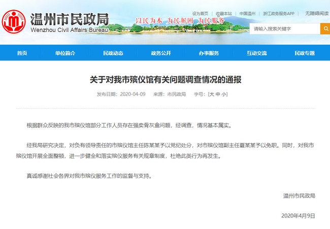 溫州通報殯儀館強賣骨灰盒:情況基本屬實