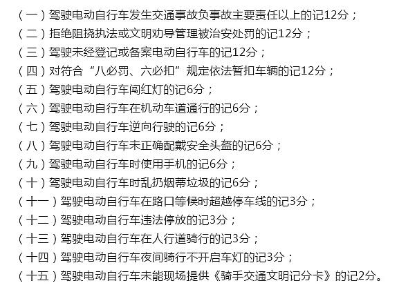 記分分值為對應騎手在道路上發生交通違法行為的嚴重和危害程度所設定,共計15項,其中阻撓執法等一次記12分的4項,闖紅燈等一次記6分的6項,違法停車等記3分的4項及1分1項(詳見文末鏈接)。