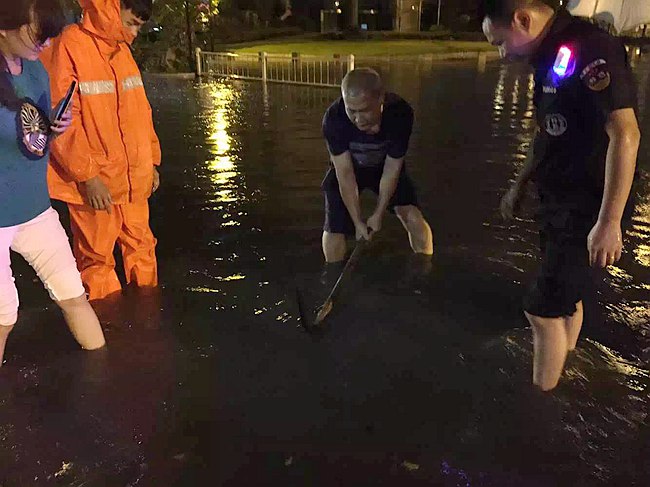 2016年,凌晨12點孫榮俊與同事在車站外做好抗臺防汛工作。