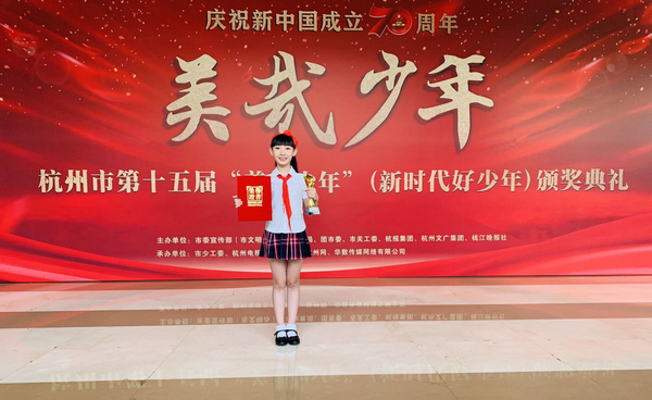2018年,我被評為“全國優秀少先隊員”;去年,我又被評為“杭州市美德少年”。