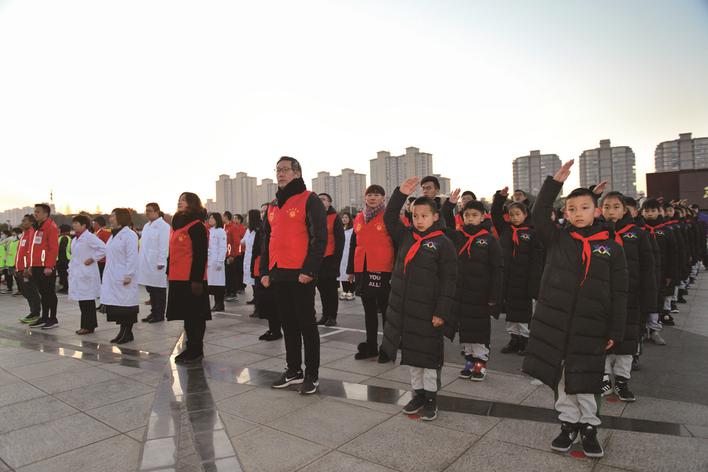 1月1日早晨6:54,嘉興市南湖區行政中心廣場迎來了一場莊嚴的升國旗儀式,醫務工作者、現役軍人、公安干警、教師、少先隊員、志愿者、機關干部等600多位各界代表,列成方陣,高唱國歌,注視著五星紅旗迎著新年的朝陽冉冉升起。新年第一場升國旗儀式,表達了南湖兒女祝福祖國繁榮昌盛、慶祝中國共產黨成立100周年的喜悅心情。
