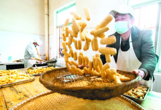 1月12日,金華市級傳統糕點制作技藝非遺傳承人徐愛國,制作民間春節用的傳統糕點——毛坦。徐愛國介紹說,毛坦制作工藝復雜繁瑣,從蒸熟毛芋、去皮搗砸、做坯、陰干,到裹糖漿、粘芝麻等,前后兩個多月。毛坦是金華市非遺項目,以前是拜年的傳統糕點之一,現在成了茶點休閑食品,隨著春節臨近,毛坦迎來了加工高峰。(時寬兵)