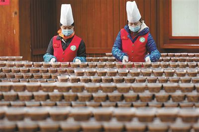 昨日(1月17日),杭州市拱墅區拱宸橋街道臺州路社區的浙江星宸會公益組織自籌資金,買來上好的食材,50多名志愿者借用香積寺內齋堂,花了一整天時間,熬制成7000余碗臘八粥,并分送到街道轄區內的敬老院、工療站、老人公寓及“運河大伯大媽”志愿者服務點,傳遞暖心關愛和新年祝福。(李忠)