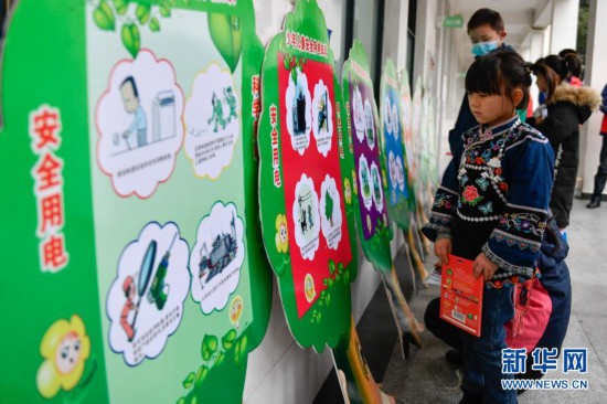 1月23日,寧波奉化區育才學校的外來務工人員子女在觀看少年兒童安全用電知識展板。