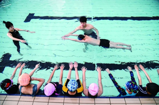 2月4日,金華市全民健身中心恒溫游泳池里,留金的外來建設者子女在教練指導下學習游泳。2月3日開始,該中心為留金外來建設者子女開展公益游泳培訓,讓孩子們掌握游泳技能以及生存和急救技能。(胡肖飛)