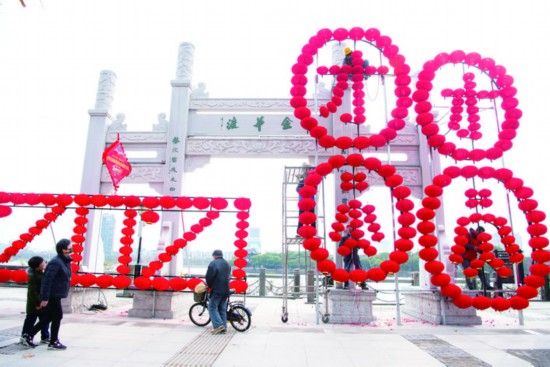 2月9日,在金華市區“金華渡”牌樓上,300多只大紅燈籠拼成“2021團團圓圓”字樣,祝福新春佳節。正在給燈籠安裝LED燈泡的施工人員說,整組燈籠景觀高7米,長13米,燈泡當天全部安裝完畢,晚上即可亮燈。記者看到,金華市區的大街小巷、主要道路兩旁都掛上了燈籠,增添了濃濃的節日喜慶氣氛。(時寬兵)
