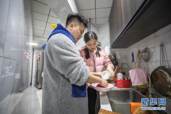 2月11日,余源(左)在家中和妻子徐婧婧一起做年“夜”飯。2020年9月,同在鐵路工作的余源和徐婧婧領證結婚。今年除夕,因為工作安排夫妻倆無法一起吃年夜飯,兩人特意將“年夜飯”提前到中午。