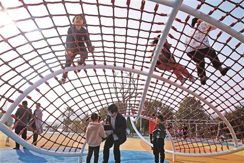 2月15日,臺州玉環市大麥嶼街道慶瀾公園內,不少家長帶著孩子來公園鍛煉身體,快樂運動。近年來,玉環市在市民聚居區周邊陸續新建了慶瀾公園、山體公園、濕地公園等多處體育主題公園,以滿足市民就近休閑、健身運動的需求。