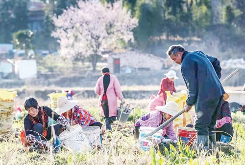 春早人更勤。近日,浙江永康市象珠水稻合作社承包的田地里,許多農戶正忙著收獲舜芋。接下來,這片田地將在翻耕后種上新的農作物。