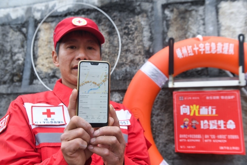 志愿者在救生裝備前展示手機上的“數字導圖”小程序。徐昱攝