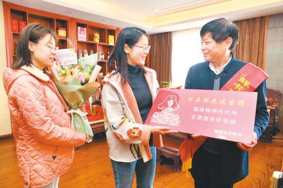 3月5日是第58個學雷鋒日,紹興市越城區開展“萬朵鮮花送雷鋒”活動,致敬新時代“活雷鋒”。目前,越城區有10余萬名志愿者,志愿組織近1300個,志愿服務觸角延伸到便民服務、平安防范、法律援助等生活方方面面。在整個3月,除了送鮮花活動,越城區還將開展“講雷鋒故事”“拍雷鋒瞬間”等系列活動。圖為越城好人、越城區道德模范余龍生收到鮮花。
