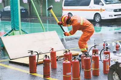 活動現場,消防救援人員利用無齒鋸、消防斧等工具對500余件不符合市場準入或質量不合格的假冒偽劣消防產品進行切割和破拆,將其徹底銷毀,杜絕了其流入市場的可能性。