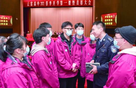 近日,浙江云富高中開展“法律進校園”法治報告會,西關派出所民警以詳實、生動的案例向全體學生講授我國現行相關法律對未成年人犯罪的規定以及當學生遇到違法行為的侵害時該如何保護自己等法律常識。(李建林)