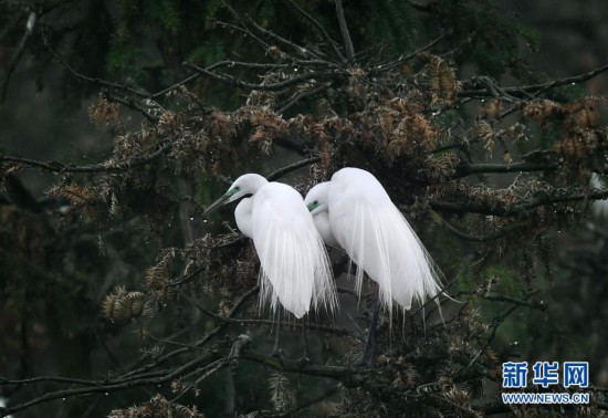 白鷺在南昌市象山森林公園內棲息避雨(3月10日攝)。(萬象)