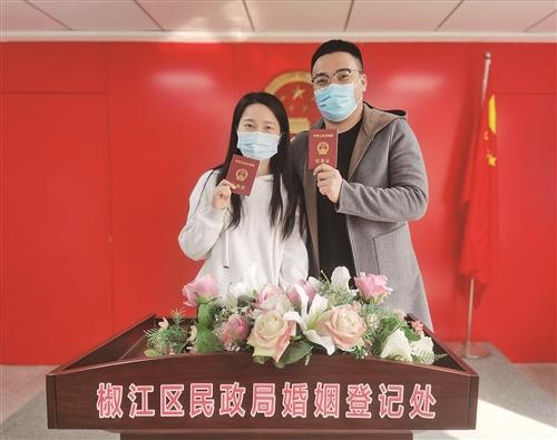2021年3月14日,諧音“愛你愛一生一世”,又正逢農歷“二月二”,被大量網友追捧為今年“最佳領證日”。為滿足新人婚姻登記需求,3月14日,臺州市椒江區民政局婚姻登記處工作人員放棄周日休息,全員加班(備勤)為新人服務,當天共辦理結婚登記28對。圖為一對新人在領證后“曬”幸福。