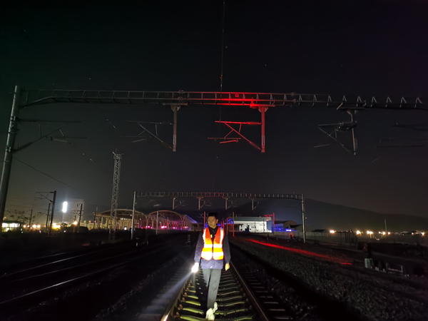 3月25日凌晨3點半,金臺鐵路臺州站行車值班員袁文豪在休班時間協助動檢巡線工作。陳美攝