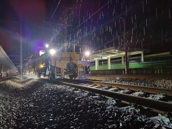 3月24日凌晨1點,金臺鐵路沿線工作人員正在冒雨進行大型機械化養護作業。章宇攝