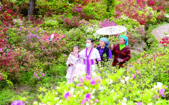 4月5日,位于金華婺城區雅畈鎮的“杜鵑王國”山坡上,20多萬株700多種杜鵑花迎春盛開。來自各地的游客趁著清明小長假前往“杜鵑王國”游玩觀賞。來自云南文山州苗族的熊美英和老鄉們特意穿上苗族服裝,用手機和自拍桿拍照,把金華的杜鵑花美景發給家鄉人分享。(時寬兵)