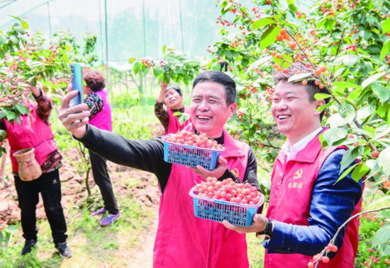 4月10日,金華市金義新區赤松鎮虎巖村舉辦第四屆櫻桃節。在農戶的櫻桃園里,村黨員幫扶小組成員穿上印有自己名字的紅馬甲,忙著給農戶網上銷售剛采摘的新鮮櫻桃。 虎巖村種植了千畝櫻桃,成為村民主要收入來源之一。該村成立了黨員幫扶小組、助跑小組、科技示范小組,指導農戶田間管理,幫助引導游客采摘,給客戶送貨,利用網絡銷售,助力櫻桃豐收農戶增收。(邵勤旦)