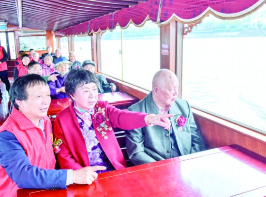 4月11日,在婺江游輪上,金婚夫婦胡柏林、祝美玲在志愿者陪同下,透過舷窗欣賞城市美景。當日下午,由金華市婦聯聯合市幸福家人公益協會,為5對金婚夫婦舉行“牽手半世紀幸福愛意暖”金婚紀念慶典活動。5對金婚夫婦感慨半個世紀的變化,慶幸遇上了好時代,不禁和志愿者一起高唱起了《沒有共產黨就沒有新中國》。(吳潮宏)