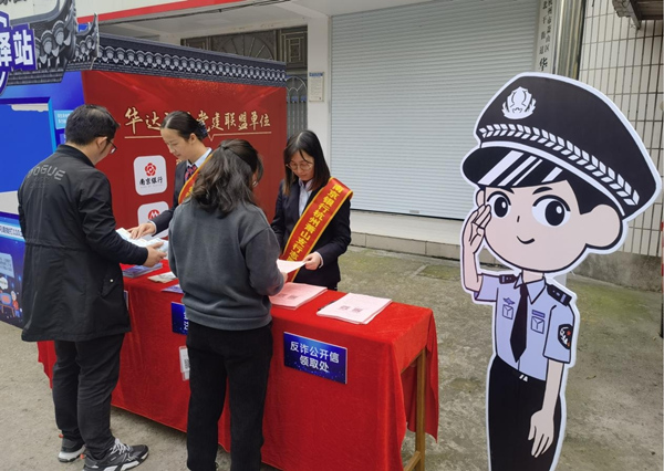 協議簽訂后,該支行現場開展了一場防電信詐騙宣傳活動。支行黨團員志愿者向社區居民發放電信詐騙宣傳資料,講解電信詐騙案例,普及防電信詐騙知識,進一步提升了當地居民防范詐騙能力。