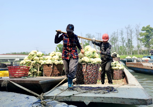 日前,記者在溫州瑞安濱海萬畝良田“三位一體”展示中心門口看到,一艘艘小船滿載著花椰菜?堪哆,兩個人合力將筐筐花椰菜挑上岸。