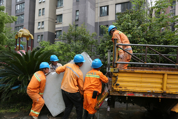 國網三門縣供電公司工作人員正在搬運廢舊物資。程亞軍攝