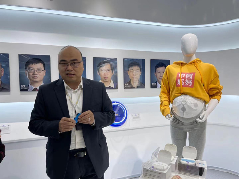 浙江清華柔性電子技術研究院常務副院長馬少鵬介紹柔性體溫監測儀的功能。人民網 王蕭蕭攝