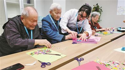 簡單的手指操活動之后,開始了手工勞作課時間,在工作人員的指導下,爺爺奶奶興趣高漲,歡聲笑語不斷。