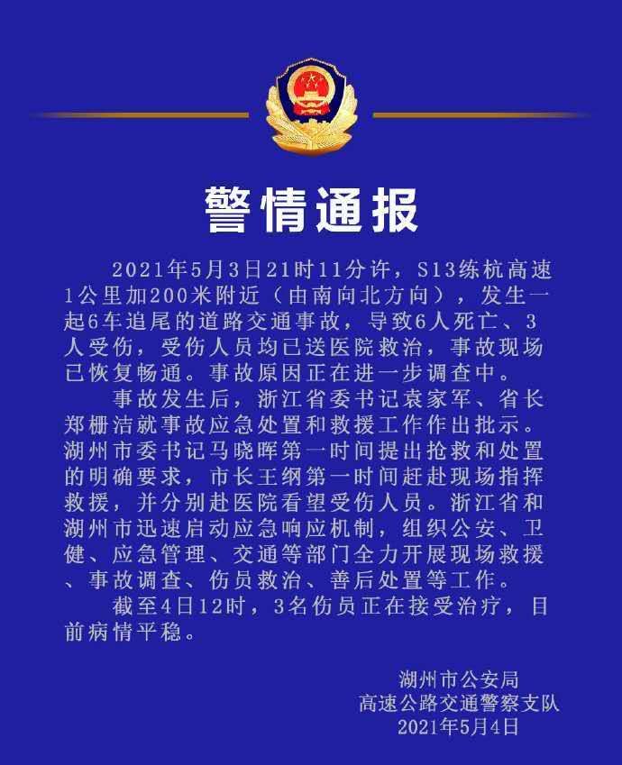 人民網杭州5月4日電 (金忠耀)記者今日從浙江湖州高速交警獲悉,2021年5月3日21時11分許,S13練杭高速1公里加200米附近(由南向北方向),發生一起6車追尾的道路交通事故,導致6人死亡、3人受傷,受傷人員均已送醫院救治,事故現場已恢復暢通。事故原因正在進一步調查中。