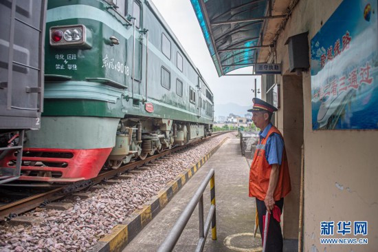5月7日,童振亮在蘭江鐵路大橋橋頭進行接車作業。