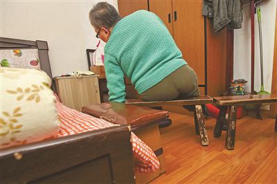 “右手基本使不上勁,左手的關節也有毛病了!彼文棠唐綍r在家里行動,全靠兩條木板凳代替雙腿行走。而兩條凳子高度只有20多厘米,因此,在她的家里,馬桶、水池、木柜、床等各種設施,高度都要比普通家庭低很多,只為方便她坐在凳子上使用。