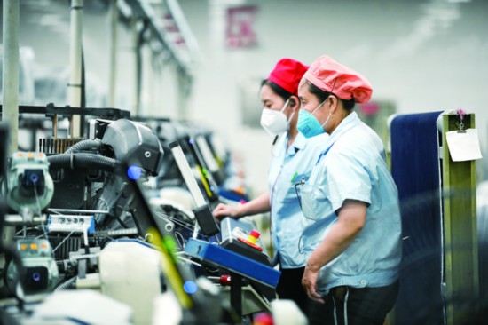 5月12日,金華蘭溪市浙江金梭紡織有限公司牛仔面料自動化生產車間里,一派忙碌景象。今年1至4月,出口額位列全國牛仔面料企業前三位的浙江金梭紡織有限公司產銷兩旺,牛仔面料產值、產量再創新高,外銷出口達570余萬米,環比提高63%;內銷市場拓展成效明顯,內外銷比例趨向平衡合理。(胡肖飛)