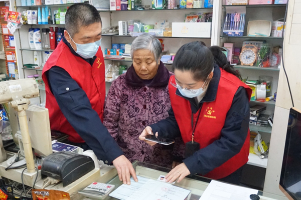 黨員服務隊上門指導81歲零售戶通過“浙里辦”辦理煙草專賣零售許可證延續手續。樓江攝