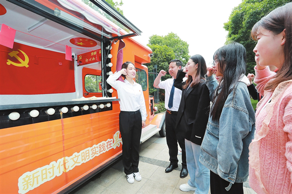 湖州朝陽街道定安社區黨總支創新黨史宣傳陣地,日前組織青年黨員開展車廂“微課堂”。利用新時代文明實踐站“一元·益愿”便民服務車打造流動黨史課堂,讓青年黨員重溫入黨誓詞,誦讀紅色經典,書寫入黨初心,重溫黨的百年歷史。(王潔涵)