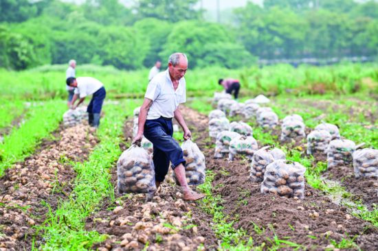 5月24日,金華金義新區澧浦鎮馬鈴薯示范基地里,農民趁雨歇搶收馬鈴薯。該馬鈴薯示范基地面積150畝,今年畝產可達3500多公斤,喜獲豐收。近些天連續降雨,當地農民搶抓時機搶收馬鈴薯,減少損失保增收。(胡肖飛)