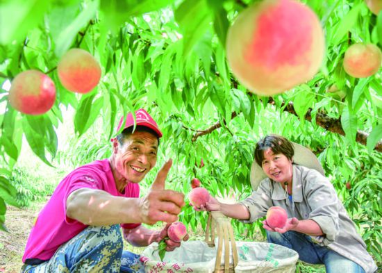 5月25日,趁著晴好天氣,在金華婺城區白龍橋鎮董村,汪繼清家庭農場的場主汪繼清和妻子一起開摘今年剛剛成熟的桃子。這里通過四年培育有160多畝桃林,主要栽種的是水蜜桃品種之一的“春美”!斑@個品種口感比較脆爽,關鍵是上市早,比本地桃子早10天左右采摘!蓖衾^清表示,這兩年來他的水果通過網絡平臺、實體連鎖店銷售,今年桃子也搭上了銷售快車道。(吳潮宏)